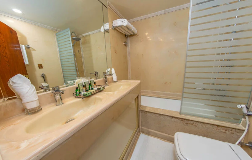Indulge in the luxurious cabins and suites aboard Solaris I, each thoughtfully equipped with air conditioning, en suite toilets, satellite TV and minibars, providing unparalleled comfort throughout your stay. To enhance your sailing experience, the ship's amenities include a swimming pool, sundeck with loungers, exercise center, spa, and a restaurant serving delicious Egyptian and international cuisine. The well-stocked bar, inviting lounge area and 24-hour check-in desk cater to all your needs.